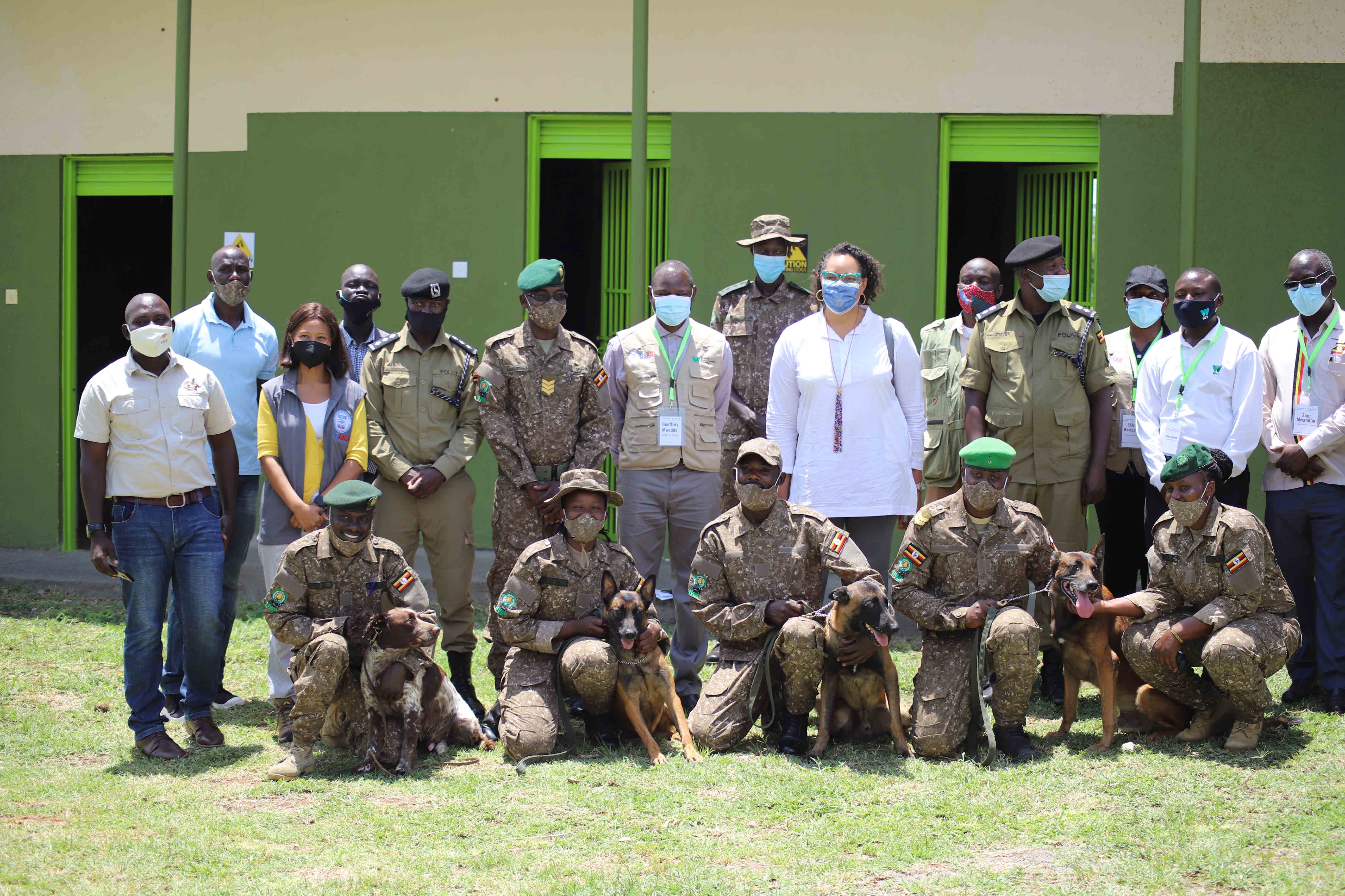 The U.S. Ambassador, H.E. Natalie Brown (with a necklace) together with Geoffrey Mwedde, Chief of Party, USAID/Uganda CWC Activity (to the left(L) with the dog handlers (squatting) at the canine unit supported by the Activity. Also present were: Sam Mwandha, UWA Executive Director (standing far right (R) Simon Nampindo, WCS Country Director (2nd R) Superintendent Ondoga Jonny, DPC of Kiryandongo District (3rd R); Detective Sergeant Kabarangira Mann, Commander of UWA Canine Unit (4th L) Regina Burns Mackenzie, Director- Economic Growth Office (2nd L) Abdullatif Mwanja, Technical Advisor of the Canine Unit (standing far L); and Robert Senkungu, AWF Program Manager (in the back row with red mask) |